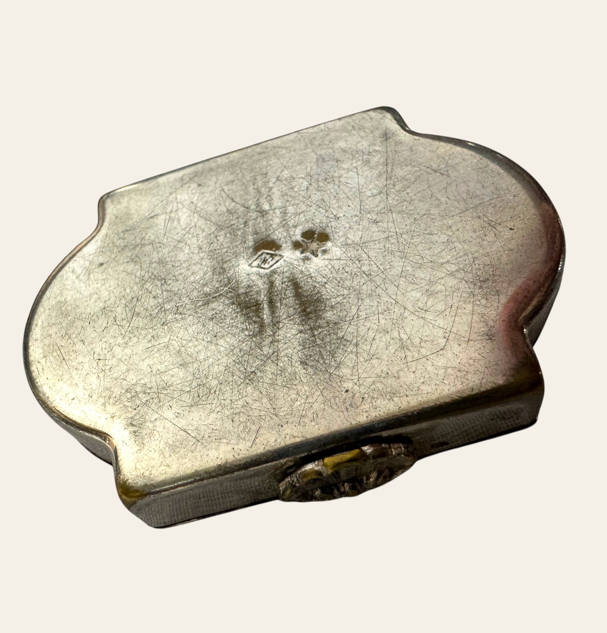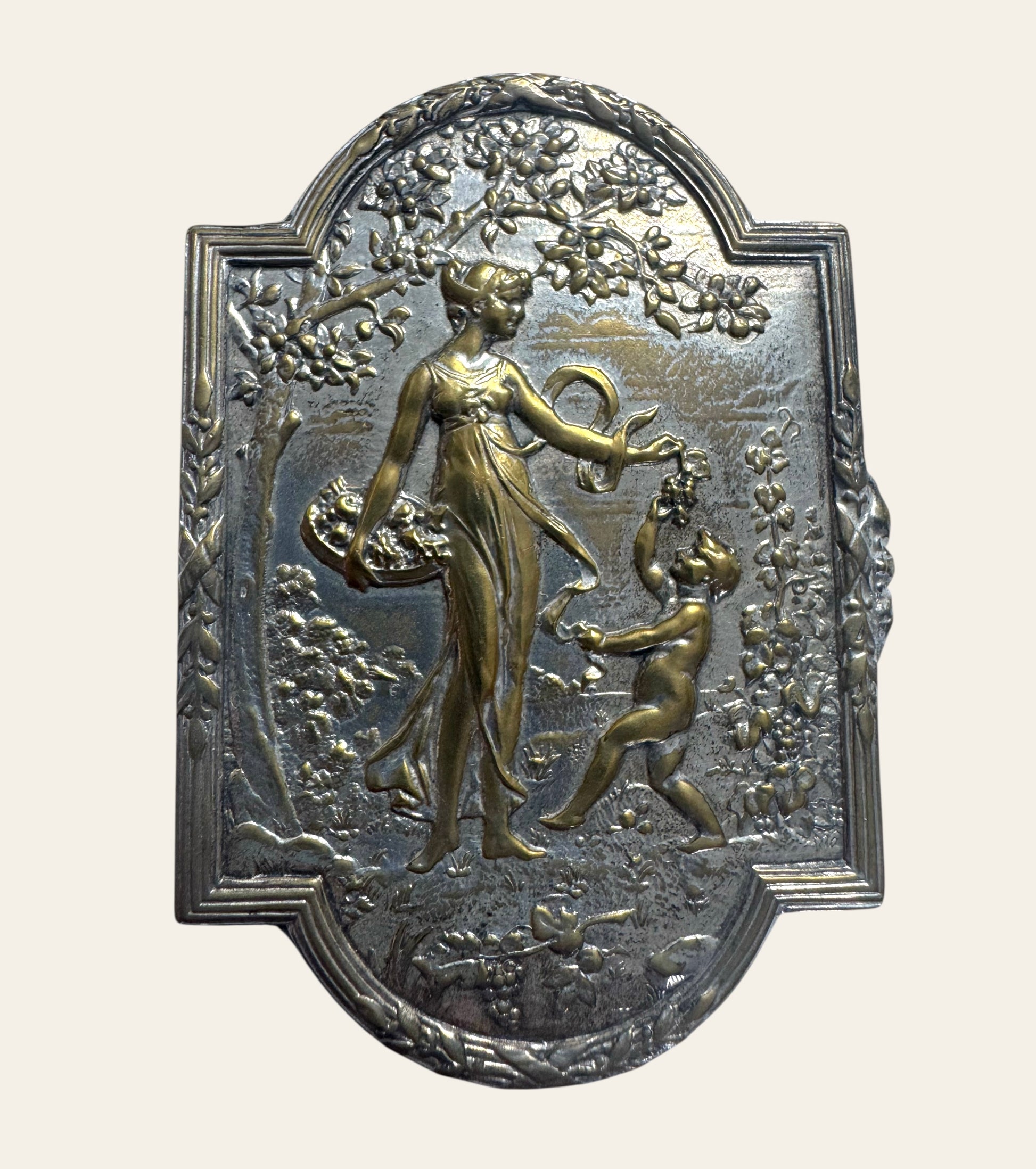 A delicate Art Nouveau silver box bathed in soft gilding, its lid alive with a classical woman and cherub beneath blossoming branches — the eternal dance of spring and renewal. Hand-chased in relief, the figures appear to float in light, framed by a sculpted floral border that mirrors the era’s devotion to nature and sensual line.