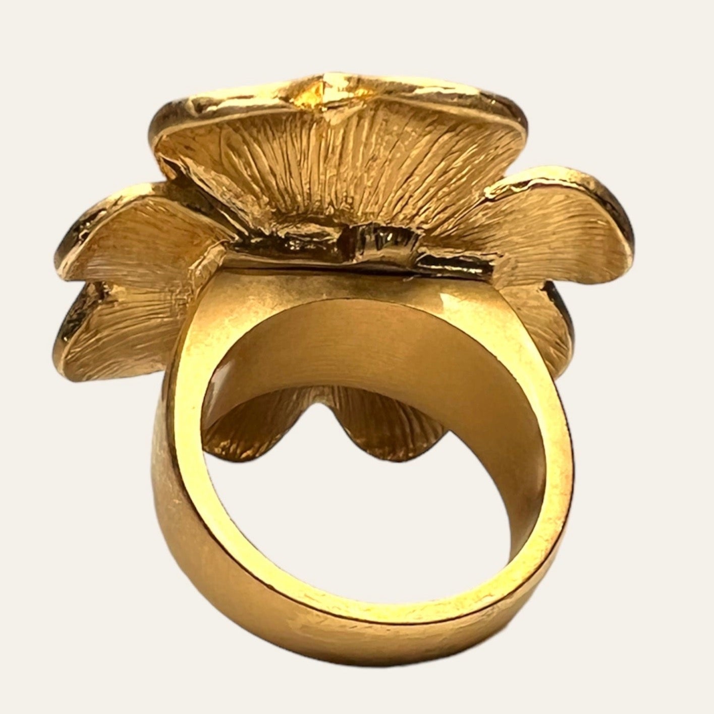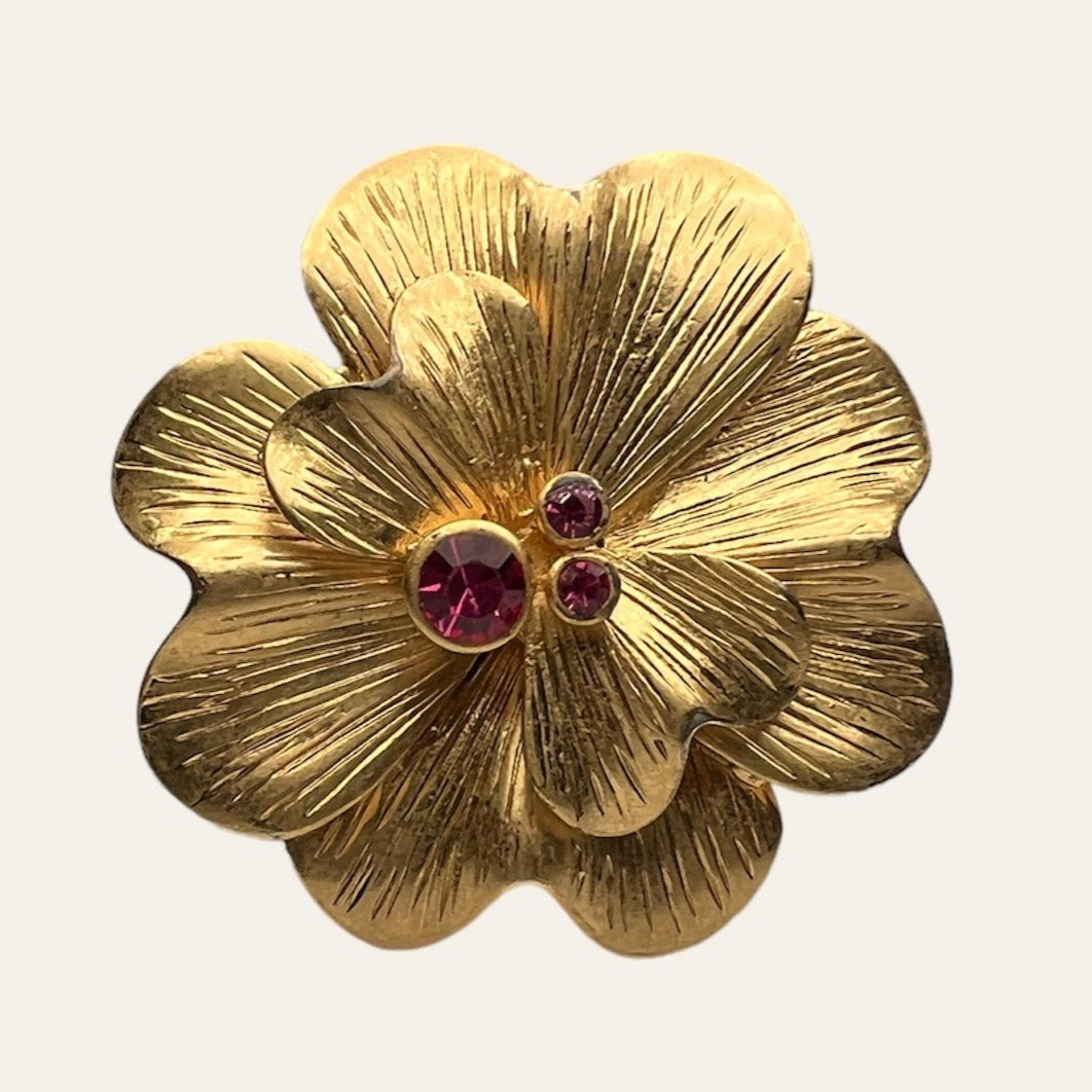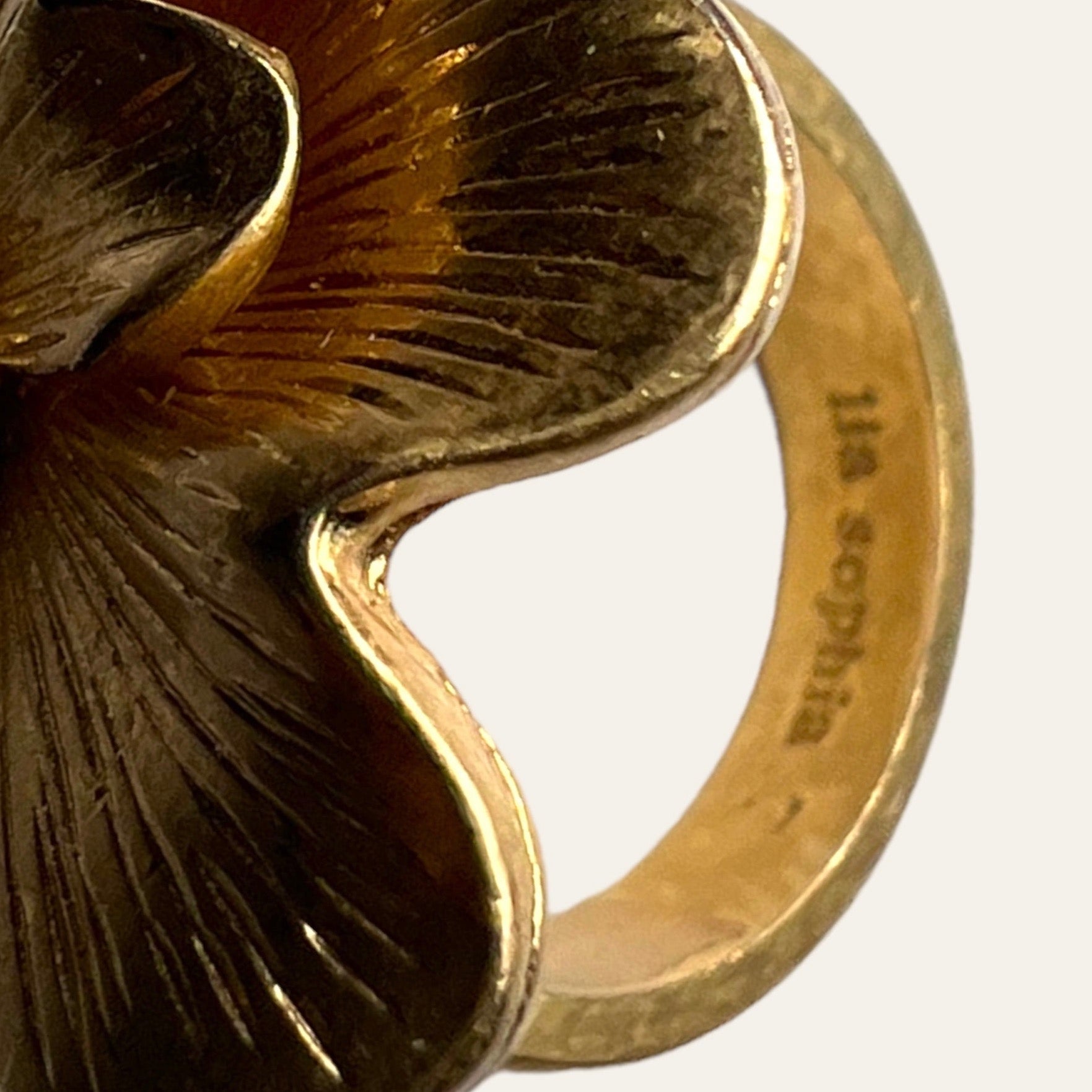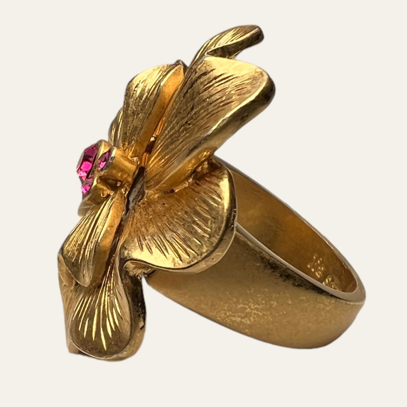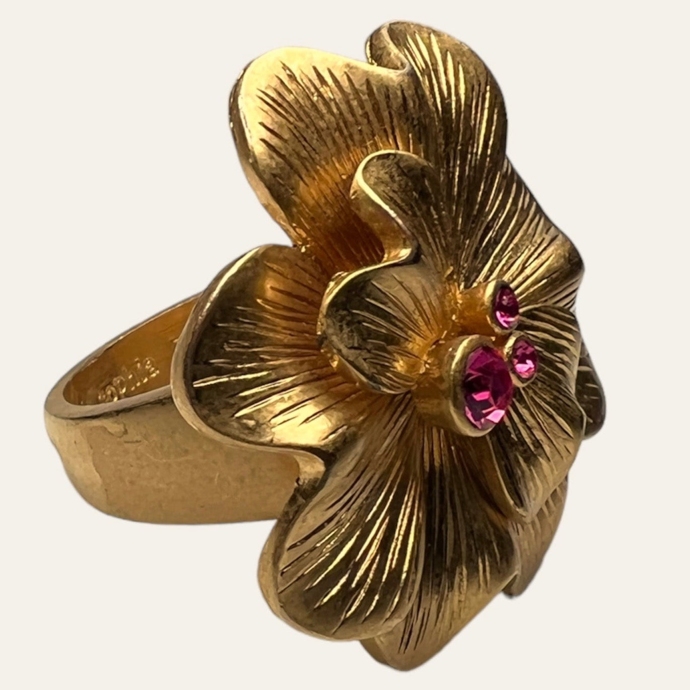Signed Lia Sophia gold tone flower cocktail ring with 3 pink crystal rhinestones.