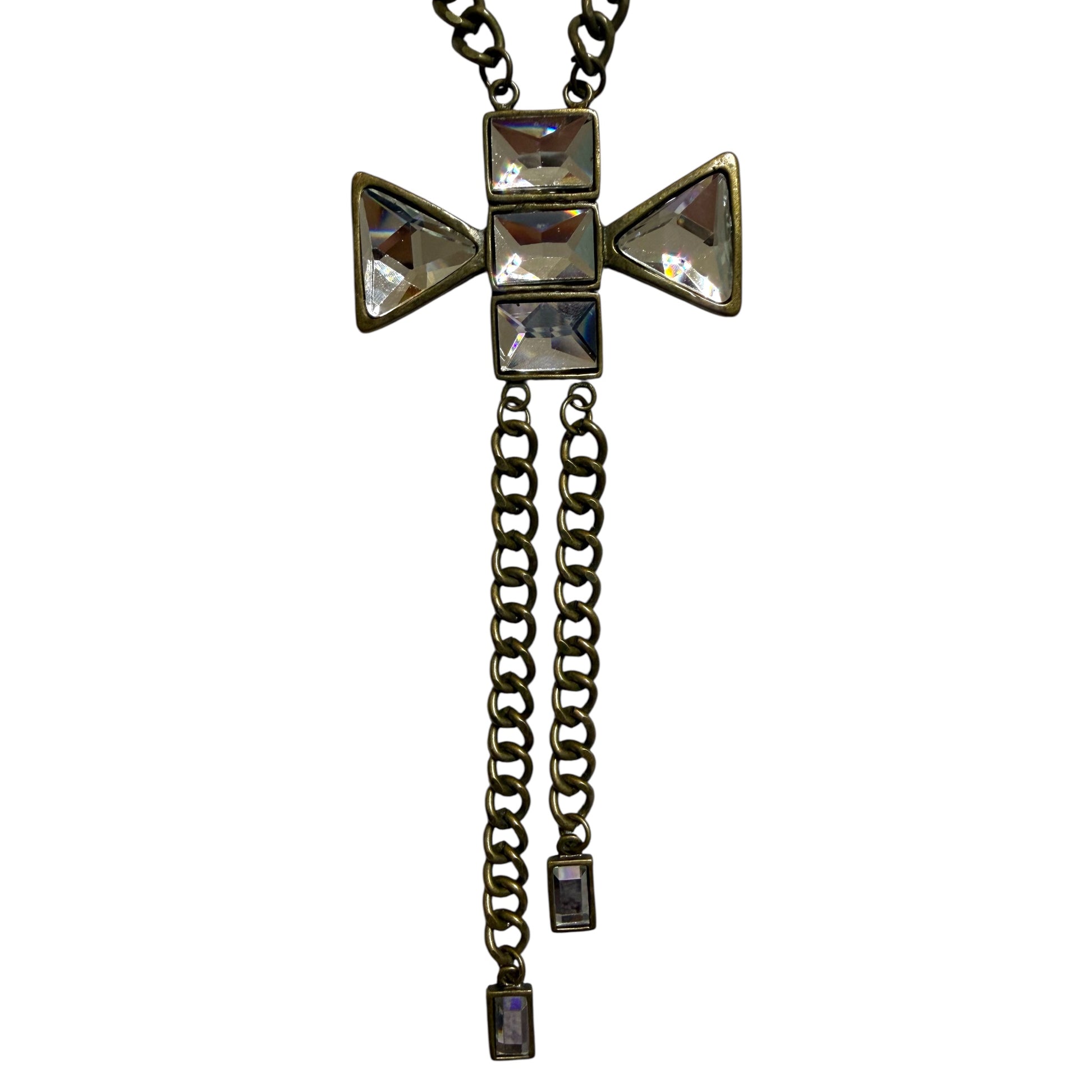 This signed Sweet Lola vintage necklace features a bold gold-tone chain with a long drop pendant designed in a cross formation. The pendant is set with faceted glass rhinestones in geometric shapes, creating sculptural, graphic look.